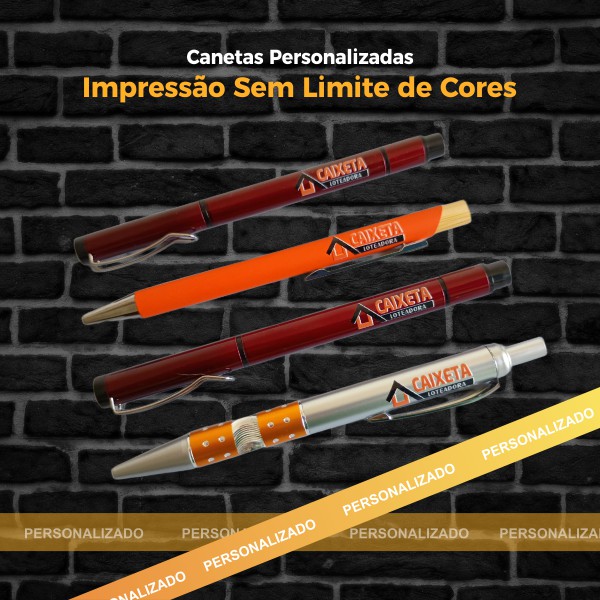 Canetas personalizadas com impressão direta no material, sem limite de cores.